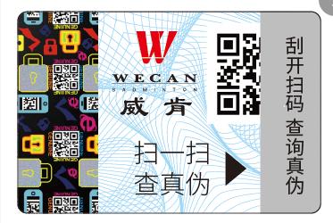 四。球筒外收縮膜上有金色防偽鐳射條(放大可見WECAN字樣),并于下方印有商品的條形碼(掃碼可顯示羽毛球型號)。